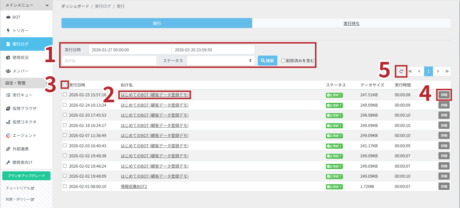 実行日時、実行したBOT名、結果のステータス、データサイズ、実行時間を確認することができます。